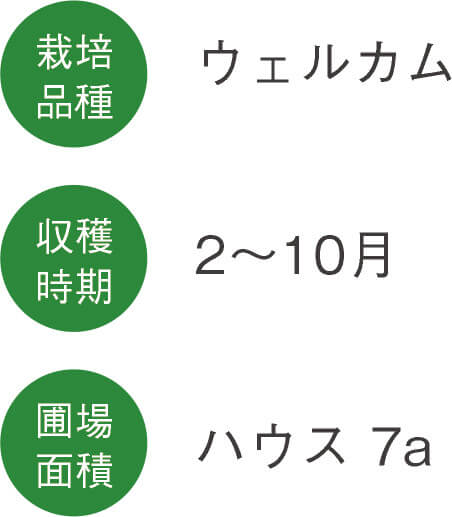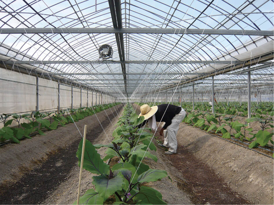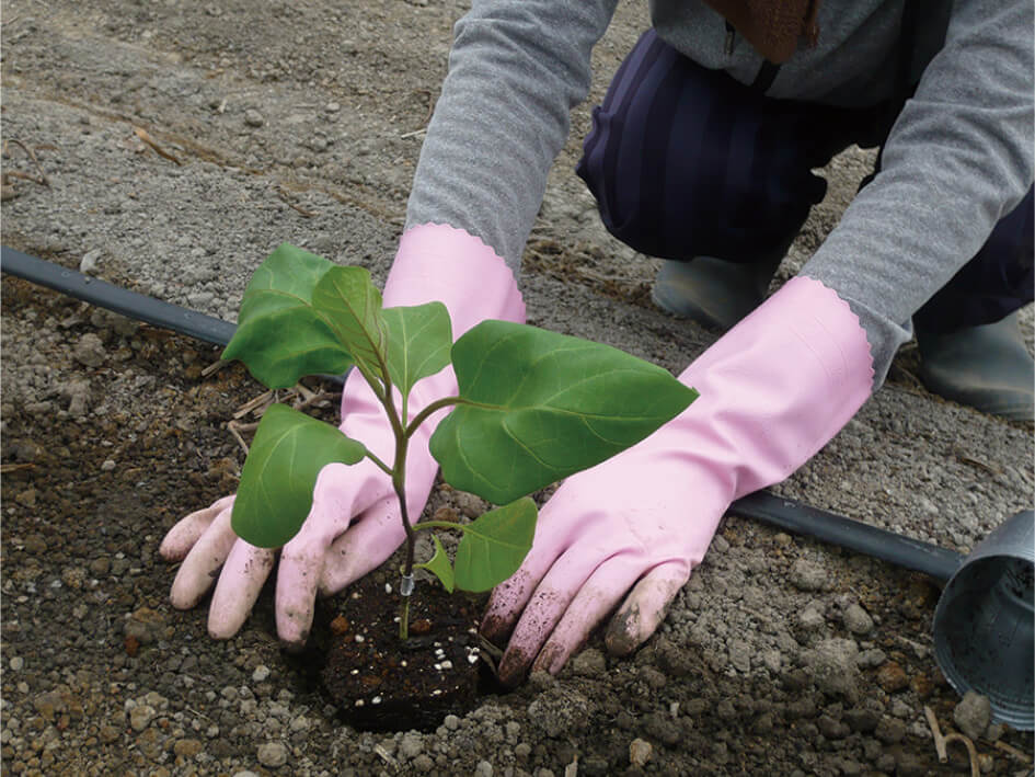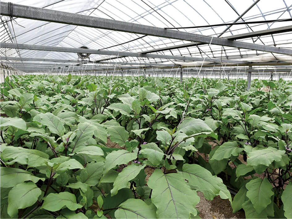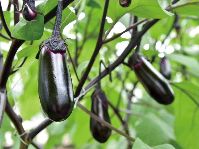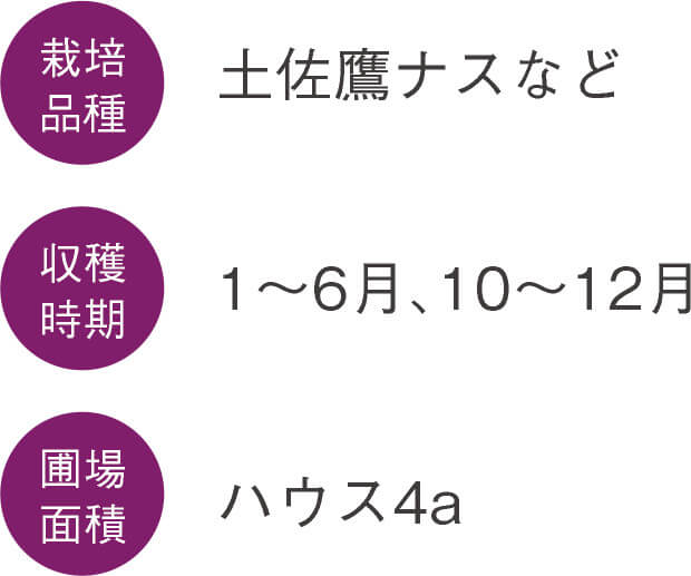 温暖な気候や長い日照時間に恵まれた高知県安芸市は、日本一の冬春ナスの生産地です。土佐のあさいち農園は、数あるナスの品種から、高知県で育種された品種を選び、天敵農法で栽培しています。さらに、マルハナバチによる自然受粉を行い、安心安全なナスづくりを徹底しています。ナスの果肉は柔らかく、食べると甘味を感じます。