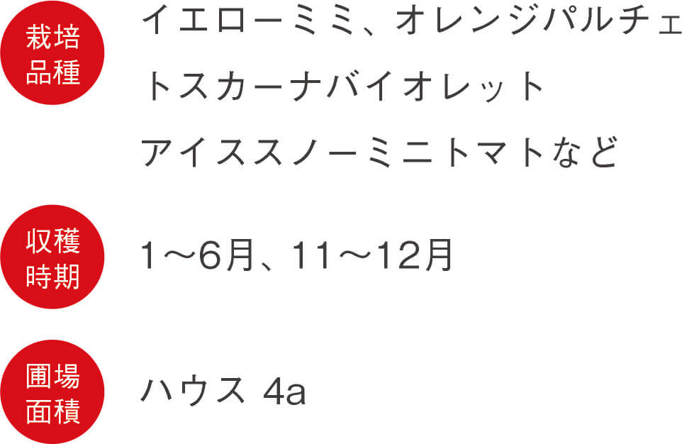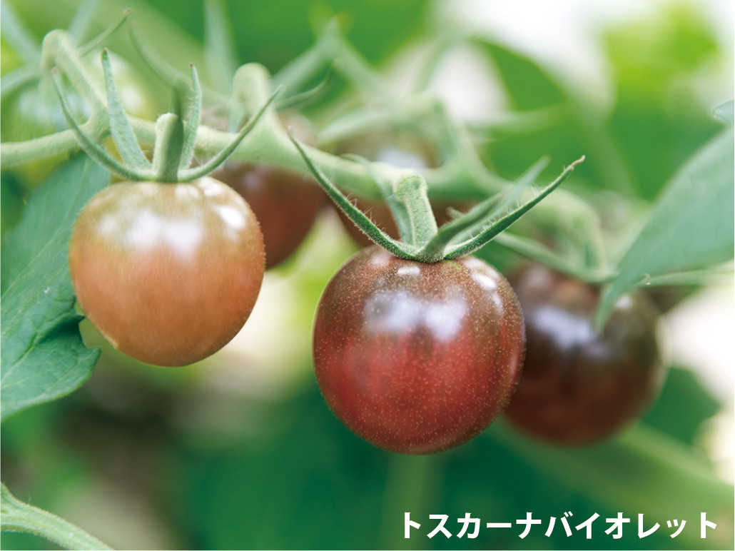 土佐のあさいち農園は日当たりが良く、温かいハウスのなかで、元気なミニトマトを育てています。化学肥料を使わず、ニガリの葉面散布で高糖度をキープ。水まきも怠りません。黄色、オレンジ、紫、白と彩りも鮮やか。フルーティーな香りや甘味を感じる品種、酸味と甘味のバランスが絶妙な品種など、トマトが苦手な方もおいしくいただけます。