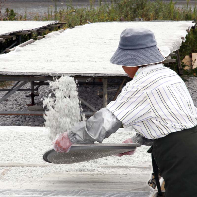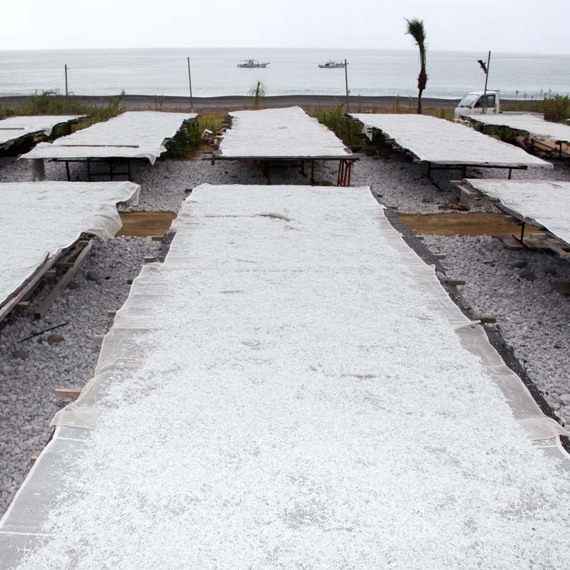 釜あげちりめんの原料となる安芸沖で穫れたイワシ類の稚魚を、加工場に運びこみ、丁寧に洗浄して砂や海藻などを落とします。次に、茹で時間や温度、塩加減など細かい所まで気を配りながら釜茹での工程に。茹で上がったちりめんは風で水気と熱気を取った後、浜辺の干し場で、その日の天気や気温によって、干し時間を見極めながら天日干しします。